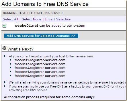 页面上:freedns1.registrar-servers.com、freedns2.registrar-servers.com、freedns3.registrar-servers.com、freedns4.registrar-servers.com、freedns5.registrar-servers.com是你域名所要指向的NS地址,记下来。点击Add DNS Service for Selected Domains>>,下一页就会提示你修改域名NS指向上面的五个地址,可以先不管,等会再说,点击OK! Go to the Hosted Domains Page,进入域名记录设置面板。